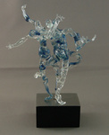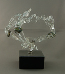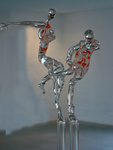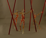 2011Opstelling van 3 glazen figuren met oranje accenten, dansend rond 6 rode glazen "stokken"