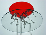 20093 voorovergebogen figuren dragen een rood schaaltje en vormen tezamen een kariatide. Ze staan op een glazen plateau welke weer gedragen wordt door 3 glasbuisjes van 150 cm hoog.