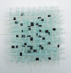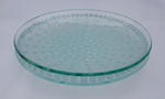 2018De schaal bestaat uit een honderdtal glazen rondjes die met elkaar versmolten zijn. Er is goud acrylverf toegevoegd in sommige glasrondjes.De schaal is vierkant en heeft openingen, het is geen gesloten vlak.